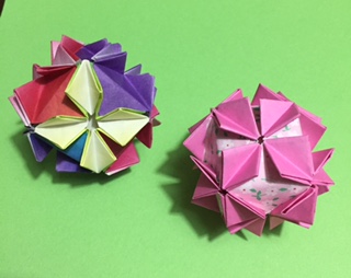 左のくす玉は、基本形のあじさい折りを7.5cmの紙で、6個折って糊づけしました。
