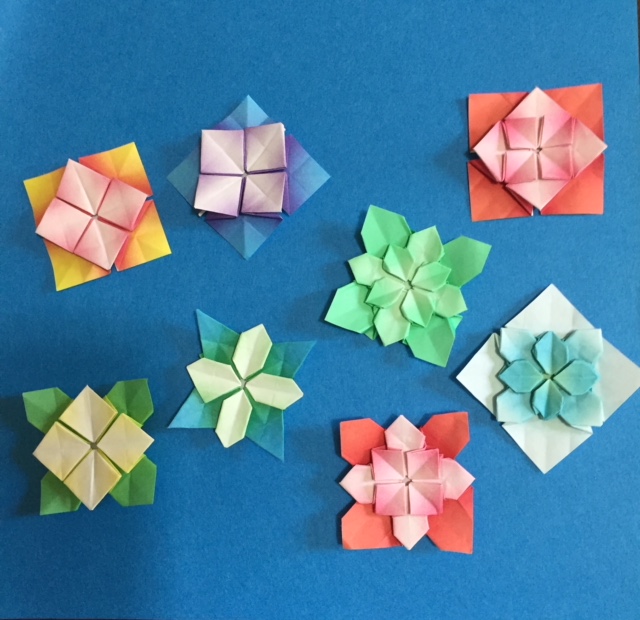 伝承折紙の百面相から、少し手を加えて花びらのように折っていきます。