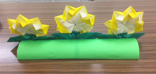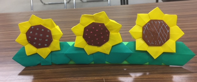 8月の折紙の会で折ったひまわりを、花芯に模様を描いて、自立させて