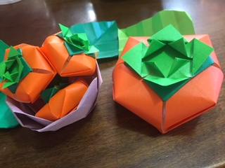 かぼちゃのおばけの菓子箱 と 魔女の帽子 を15cm角の折紙で折りました。